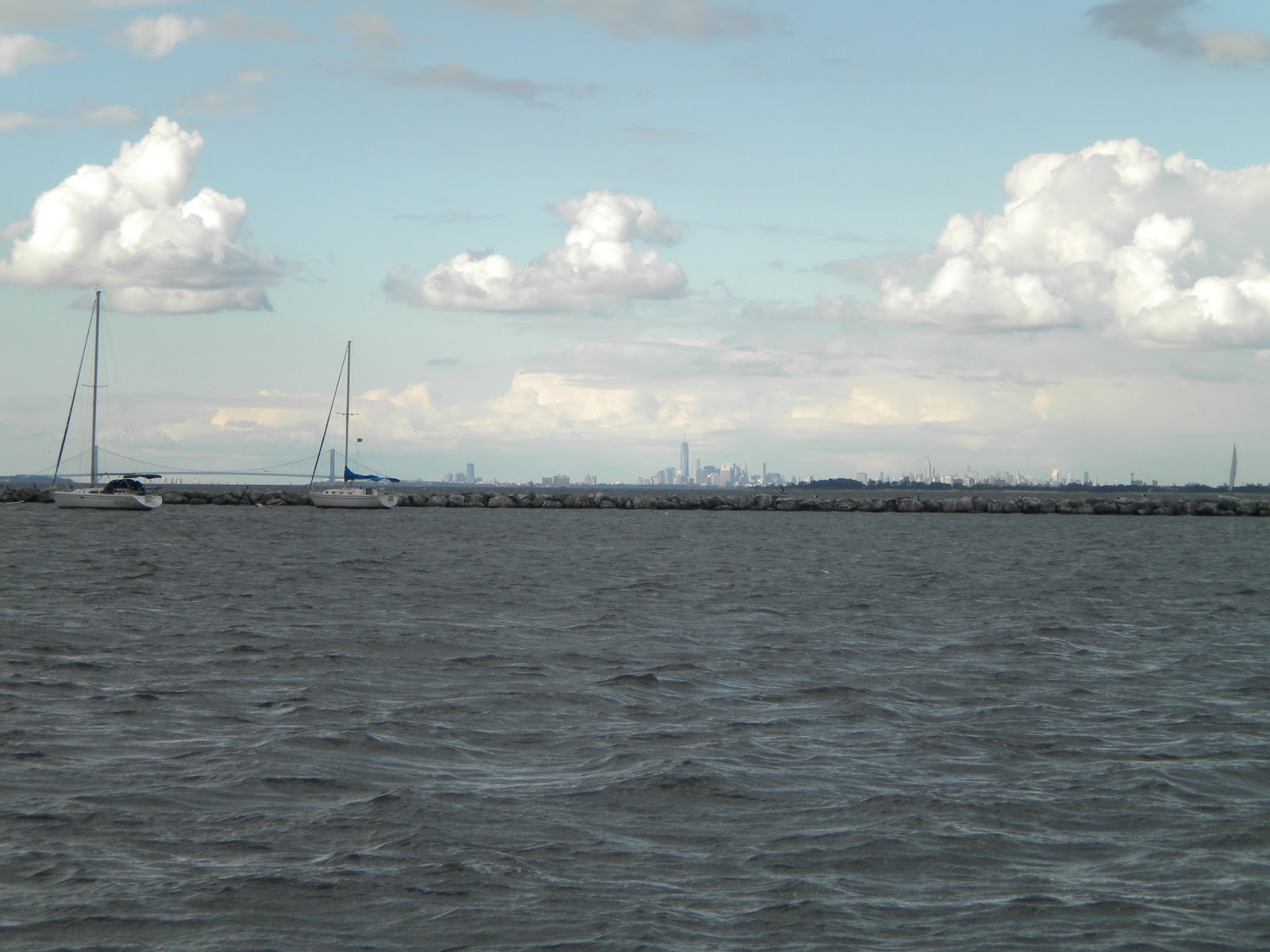 | Vue de notre ancrage, sur Grands-Pas 1. Jetée qui nous protège des vagues de la mer et New York avec le pont Verrazano sur sa gauche |